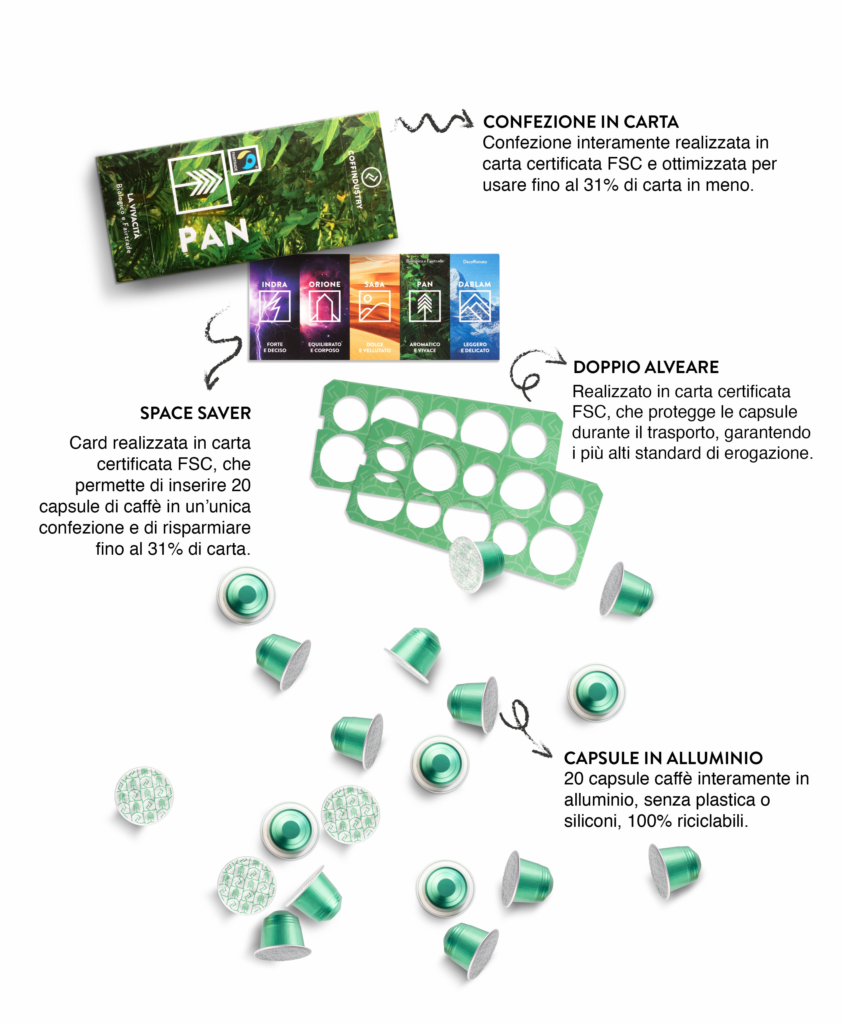 Pan é un caffe vivace e dinamico, in cui riecheggia il respiro della natura che si diffonde al ritmo di profumi di mandorle, malto tostato, frutta matura e agrumi succosi, creando una sinfonia di note piene di vita.